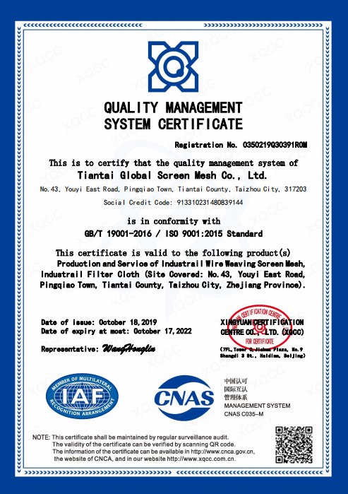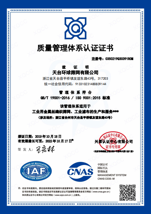 天臺(tái)環(huán)球篩網(wǎng)有限公司,成立于1995年,座落在東海之濱美麗的天臺(tái)山腳下,注冊(cè)資金500萬(wàn)人民幣,公司已通過(guò)ISO9001:2015國(guó)際質(zhì)量體系認(rèn)證。經(jīng)過(guò)環(huán)球人的不斷努力,目前公司已擁有標(biāo)準(zhǔn)廠房10,000平方米,各種篩網(wǎng)設(shè)備近100臺(tái),員工100余人,其中高中級(jí)科研及管理人員10人,公司產(chǎn)品主要有:不銹鋼網(wǎng),銅網(wǎng),電焊網(wǎng),電焊網(wǎng)片,軋花網(wǎng),不銹鋼延伸產(chǎn)品,單復(fù)絲濾布,濾布袋,壓濾機(jī)袋等。